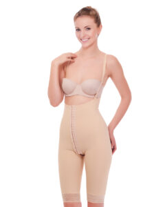 Diz üstü karın ve sırt destekli korse, karın, kalça, uyluk ve sırt liposuction ile uyluk germe sonrası iyileşme sürecini desteklemek için tasarlanmıştır. Nefes alabilen, dayanıklı kumaşı cildi kuru tutarken, üç sıralı kopçalar ve ayarlanabilir Velcro askılar kişiye özel konfor ve destek sağlar.